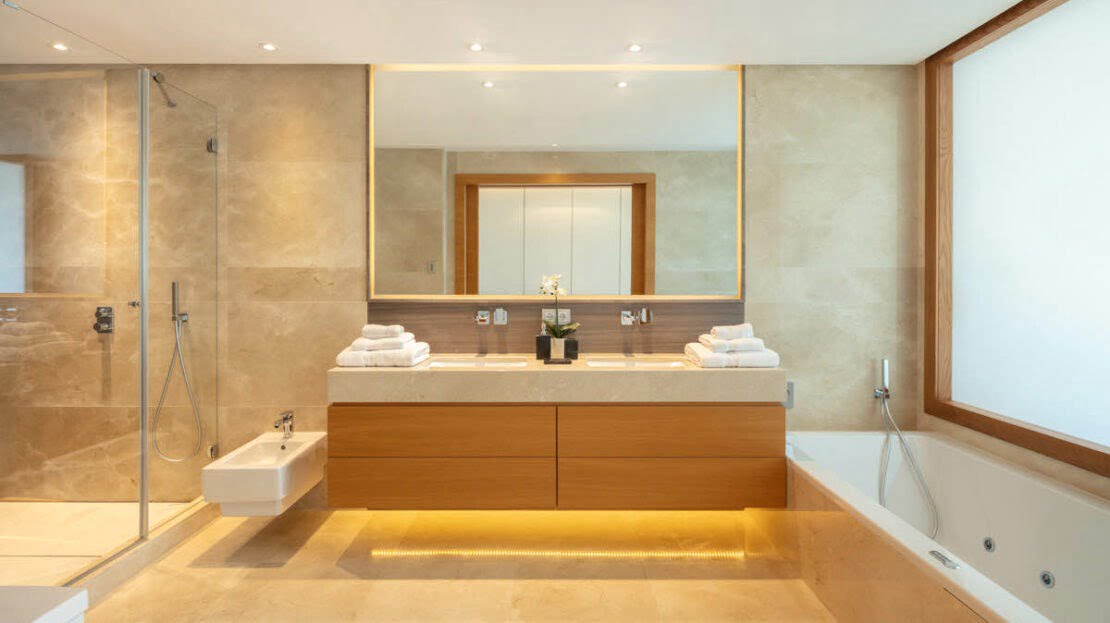 Welcomed by an expansive open plan living and dining area, expansive terraces and a spectacular solarium, this property provides spectacular panoramic views towards the scenic nature. Complete with a custom designed kitchen by SieMatic, with the use of sleek materials and including high quality appliances. The main level includes 3 generous bedrooms with elegant en suite bathrooms and fitted wardrobes, all boasting of fantastic sea views. The iconic roof top terrace has been totally prepared to be equipped with all luxury features one might need to entertain.