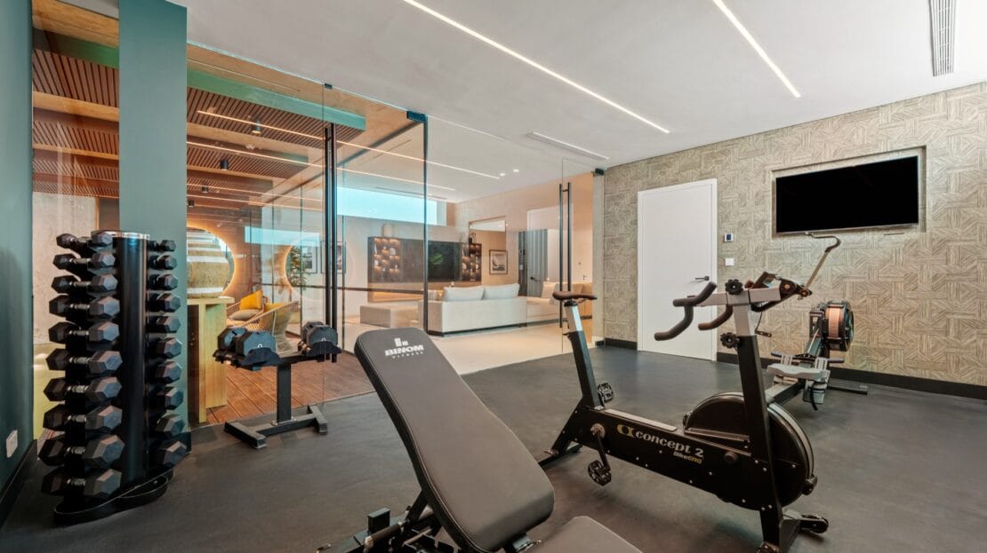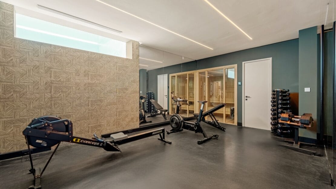 The villa’s lower level is entirely dedicated to leisure and wellbeing, featuring a state-of-the-art indoor pool, wellness spa, and a fully equipped private gym. A bespoke entertainment lounge invites moments of relaxation and conviviality — ideal for cinema nights, games, or refined gatherings with family and friends.