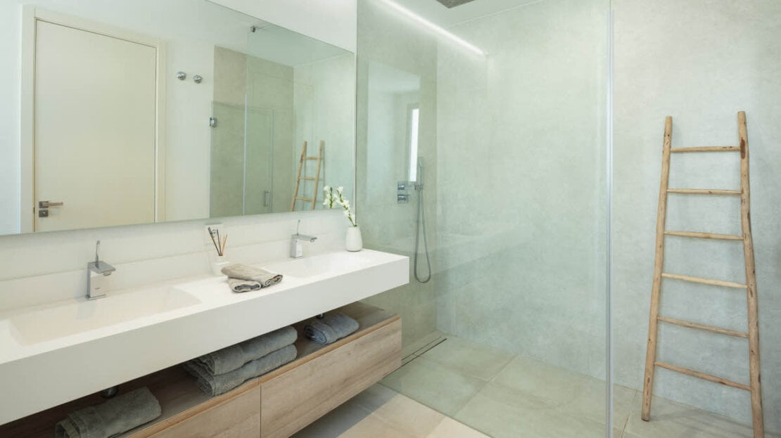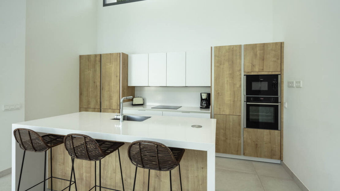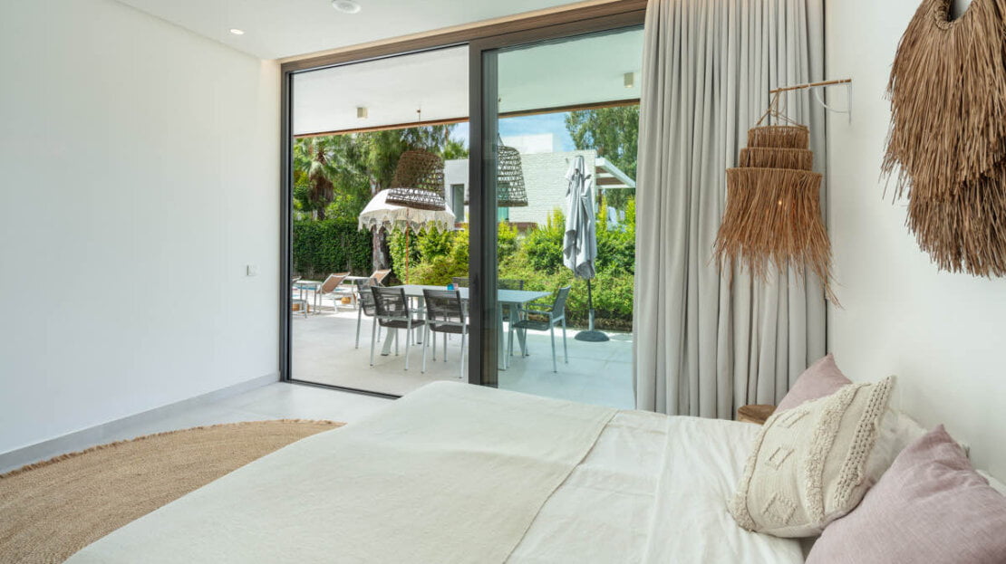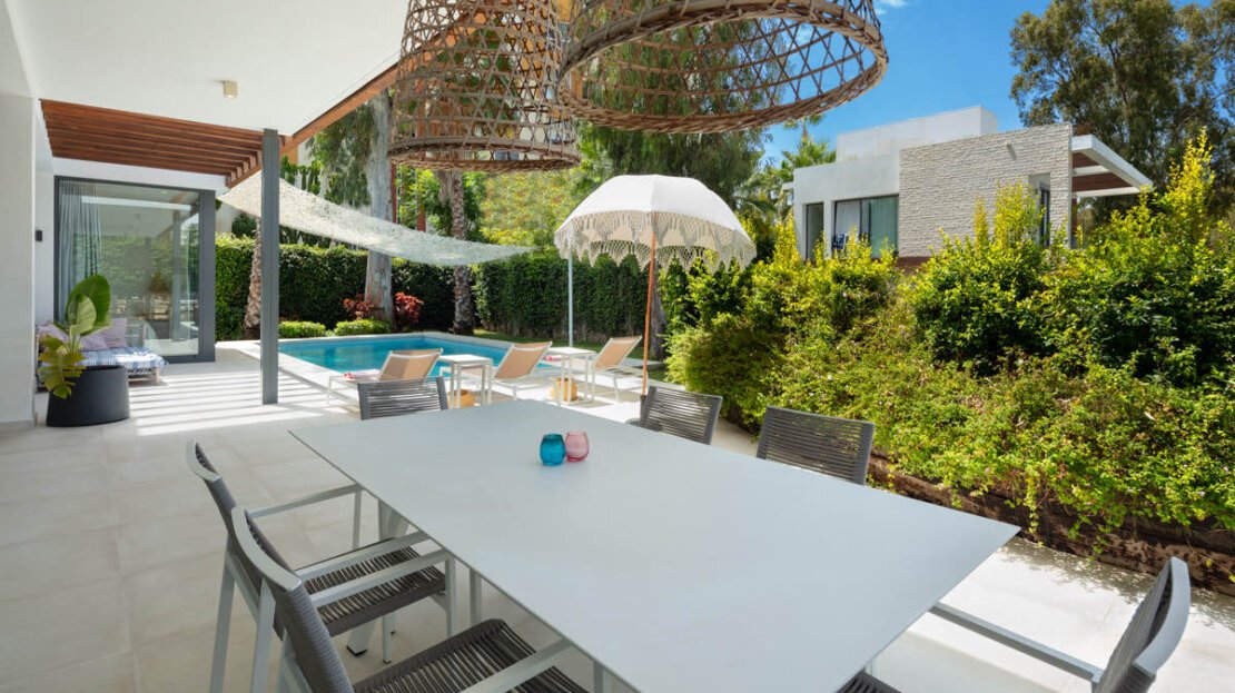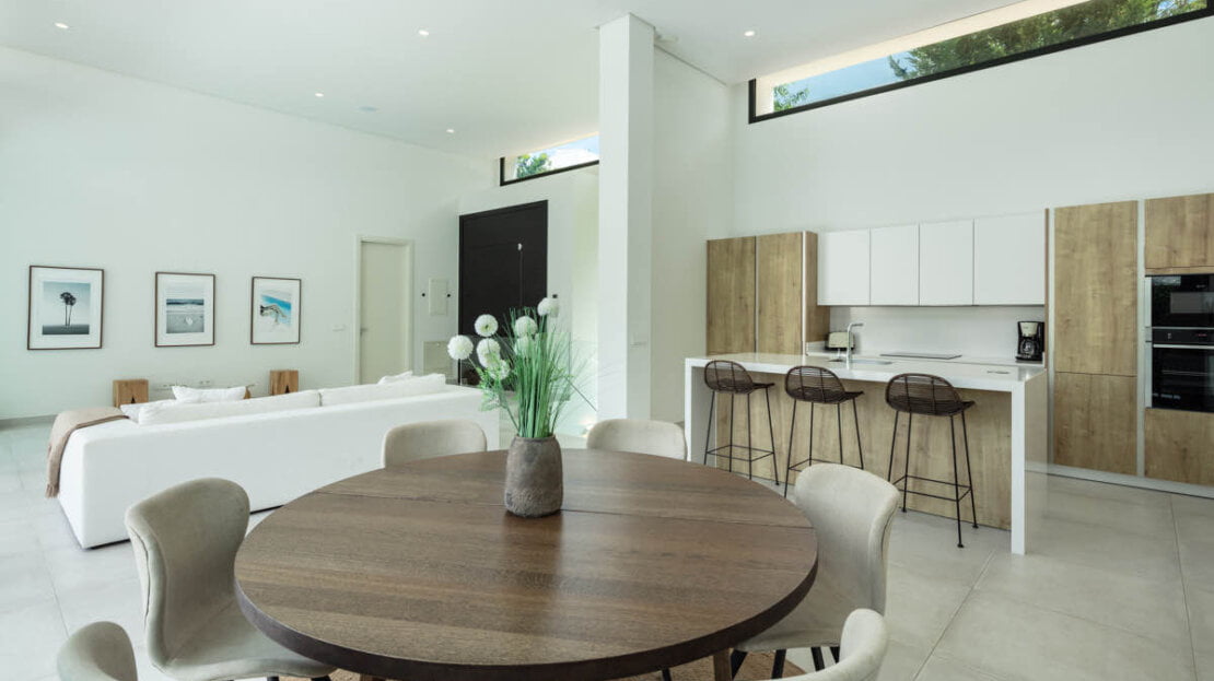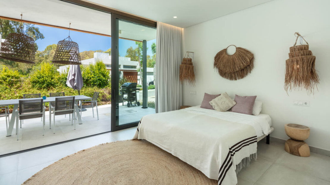The villa offers a convenient and secluded location, where all villas are South and West facing, with scenic views towards a lush green woodland – 50,000m2 of protected nature zone. A beautiful and bright home, featuring Cortizo sliding walls of glass that open to a vast terrace ideal for entertaining, outdoor dining with barbecue, and large heated pool.