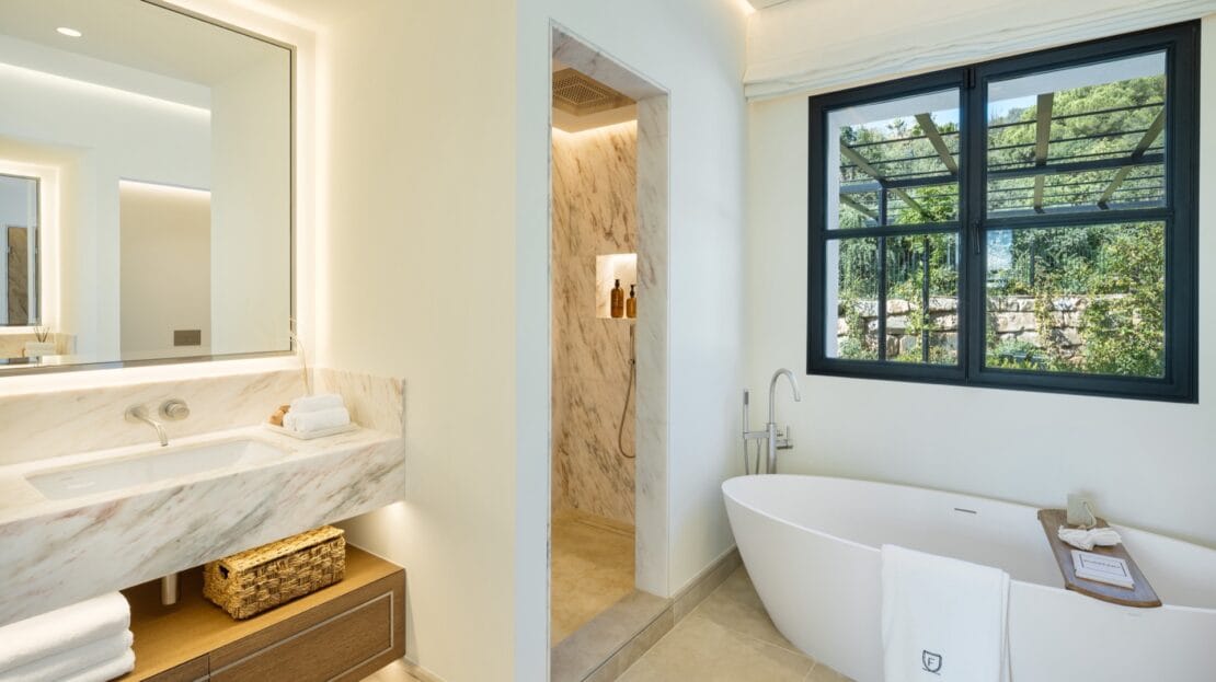 Designed by the renowned architect behind Finca Cortesin, Cascada Paradiso Estate captivates from first glance with its remarkable architecture and unique design. The exterior, finished in a sophisticated nude palette that exudes peace and serenity, is further enhanced by stunning wall flowers that add vibrant bursts of color, seamlessly integrating natural beauty into the property.