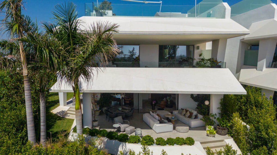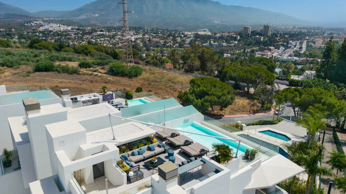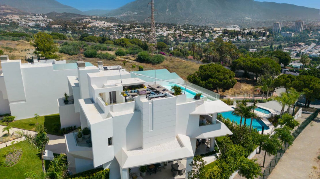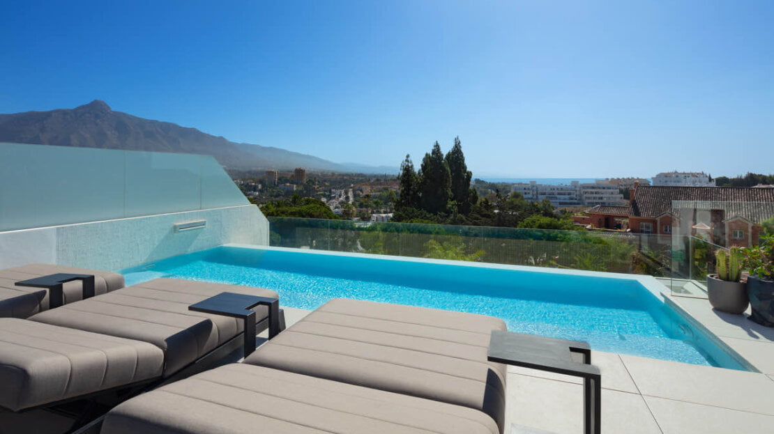 Stunning newly-built modern semi-detached villa, part of an exclusive project comprising 11 prestigious villas. Nestled within a gated community in Nueva Andalucia, showcases a unique and captivating approach to modern architecture, featuring sleek lines and a geometric facade that commands attention. The neutral-toned natural materials used for the exterior add a touch of elegance. The property offers multiple covered terraces, ideal for outdoor alfresco dining and relaxation, allowing residents to enjoy the outdoors even during brief rain showers. A private pool adds to the allure, while the bespoke solarium provides panoramic views of Nueva Andalucia, La Concha, the Mediterranean Sea and Gibraltar.