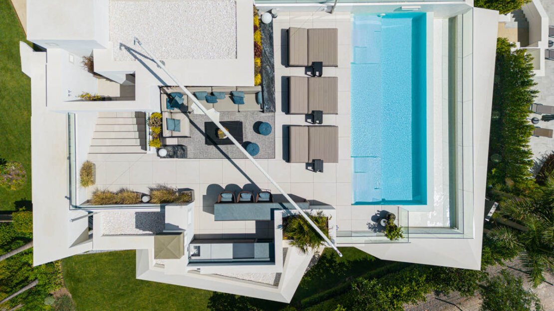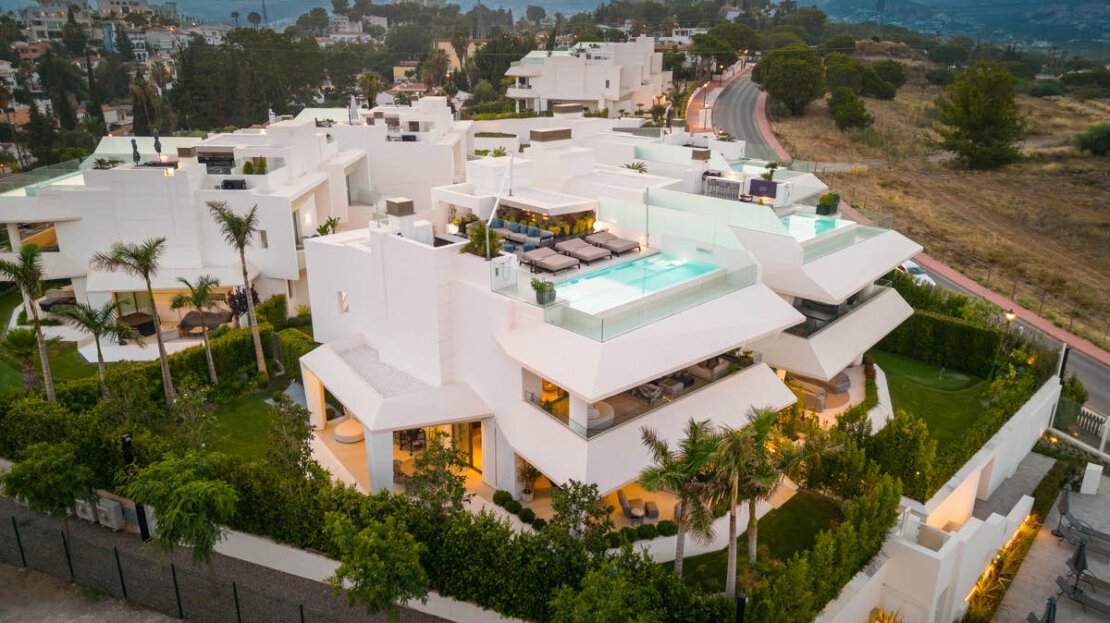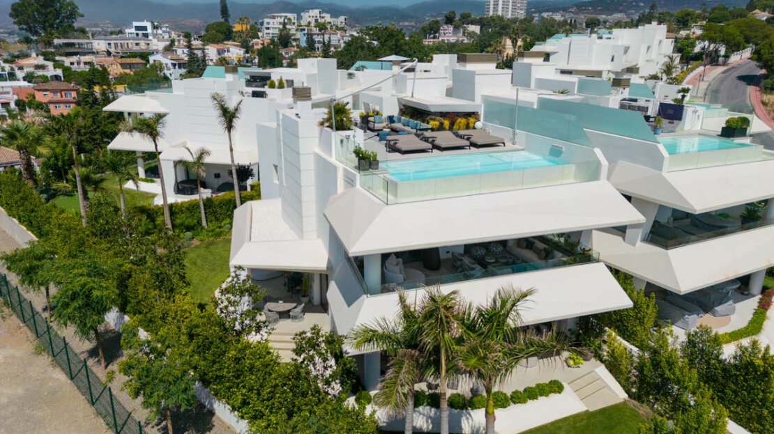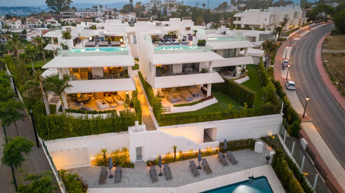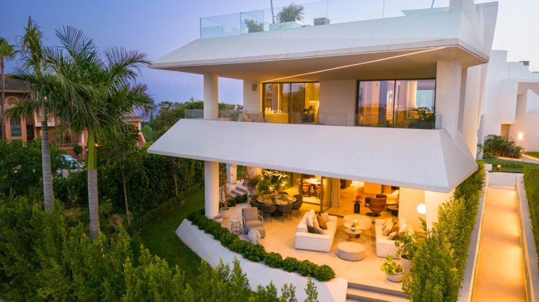 Stunning newly-built modern semi-detached villa, part of an exclusive project comprising 11 prestigious villas. Nestled within a gated community in Nueva Andalucia, showcases a unique and captivating approach to modern architecture, featuring sleek lines and a geometric facade that commands attention. The neutral-toned natural materials used for the exterior add a touch of elegance. The property offers multiple covered terraces, ideal for outdoor alfresco dining and relaxation, allowing residents to enjoy the outdoors even during brief rain showers. A private pool adds to the allure, while the bespoke solarium provides panoramic views of Nueva Andalucia, La Concha, the Mediterranean Sea and Gibraltar.