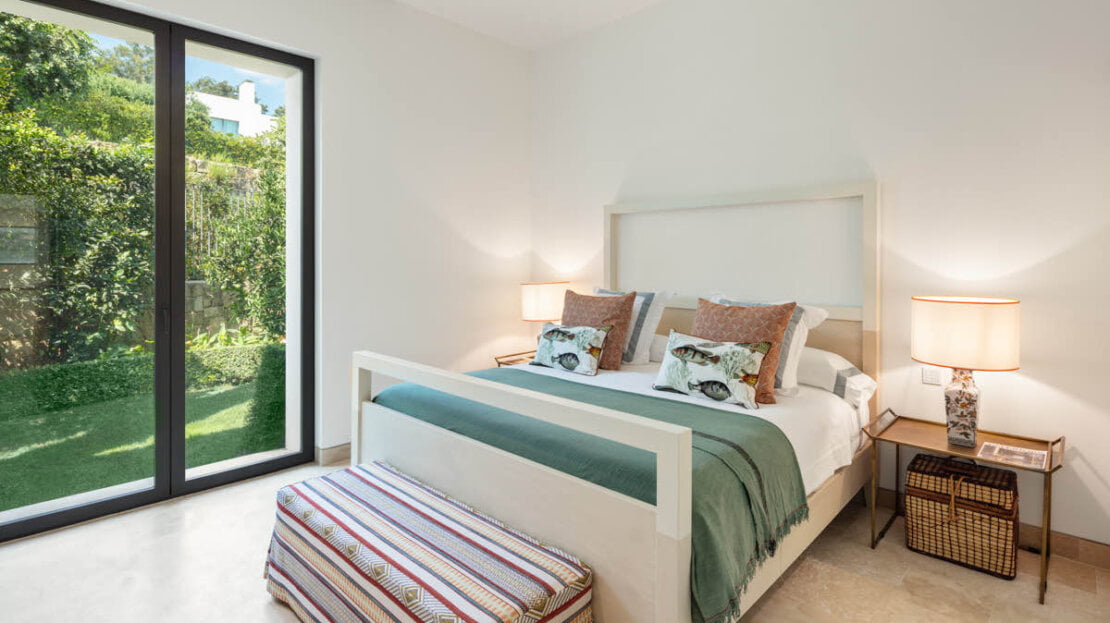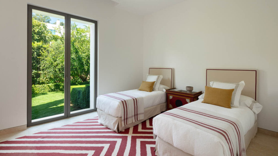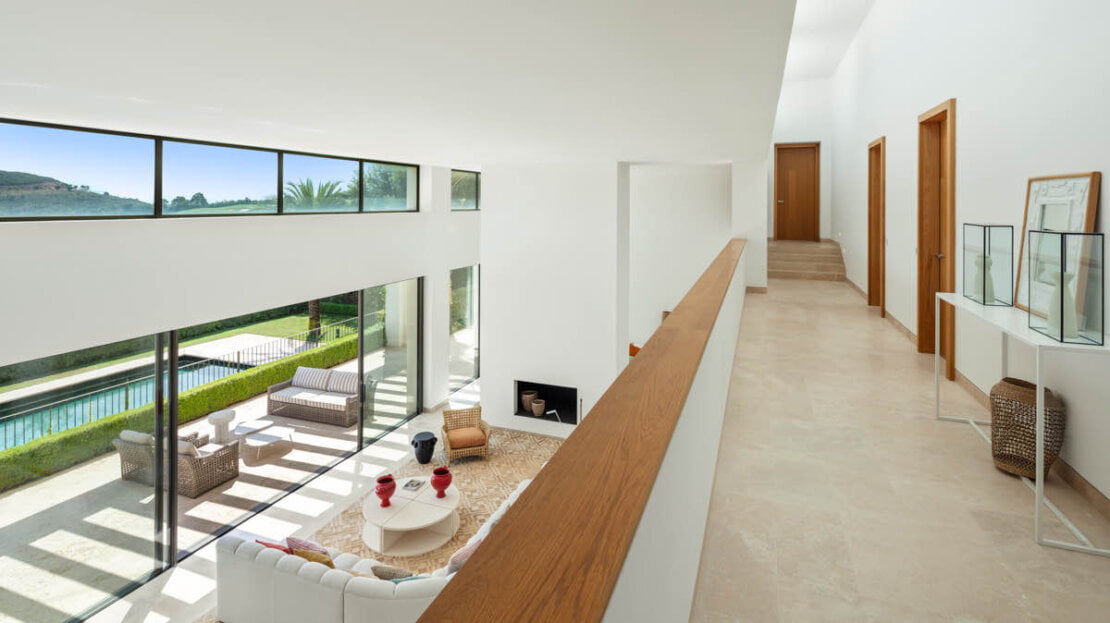 Moving to the garden level, you’ll discover expansive terraces that invite al-fresco dining and relaxation, providing the perfect setting to enjoy the meticulously manicured garden, private swimming pool and the breathtaking views of the surrounding area and golf course. While two guest bedrooms with garden access are conveniently located on the ground floor, the remaining bedrooms are nestled on the upper level. A walkway acts as an interior balcony, gracefully connecting the rooms and offering glimpses of the living area below, while skylights illuminate the space with natural light. Each bedroom boasts access to the upper-level garden area that envelops the property, and every room enjoys the convenience of a private bathroom. The opulent master bedroom, generously proportioned and adorned with pristine views, provides a true haven of tranquillity.