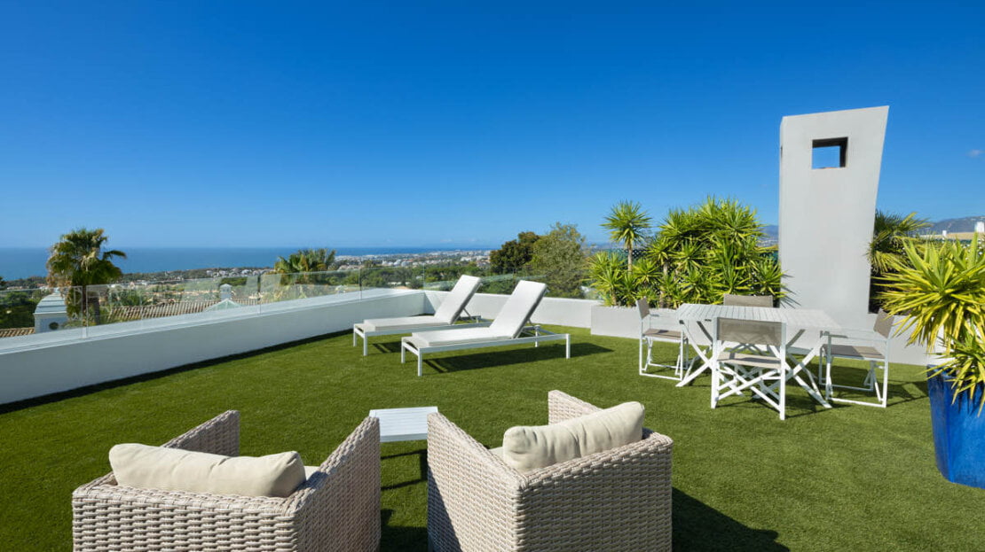 The main level includes 3 generous bedrooms with elegant en suite bathrooms and fitted wardrobes, all boasting of fantastic sea views. The iconic roof top terrace has been totally prepared to be equipped with all luxury features one might need to entertain.