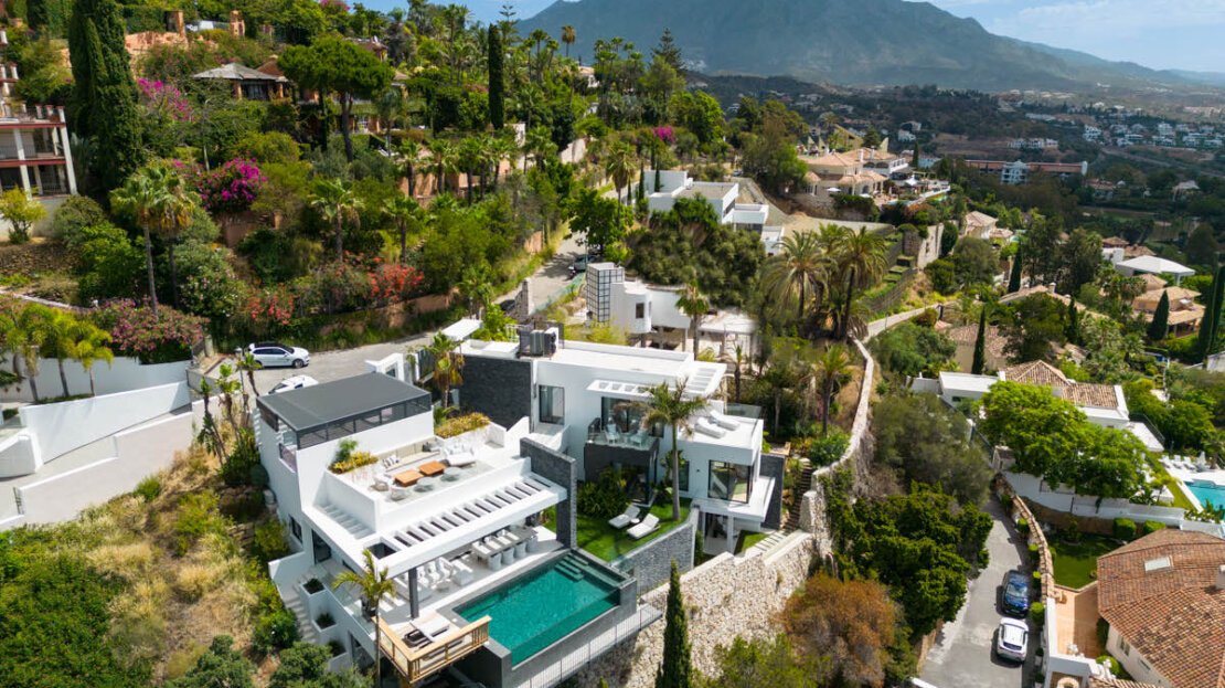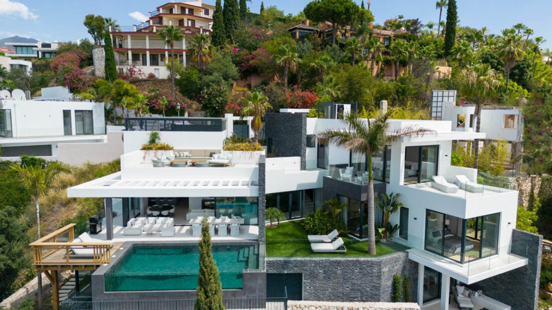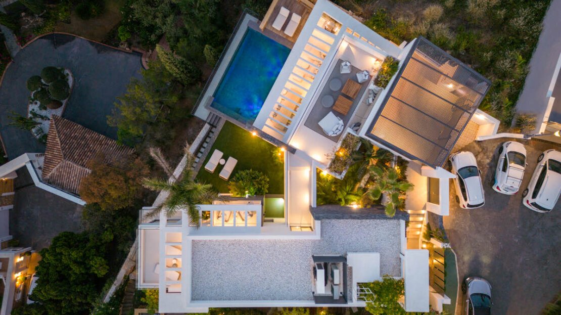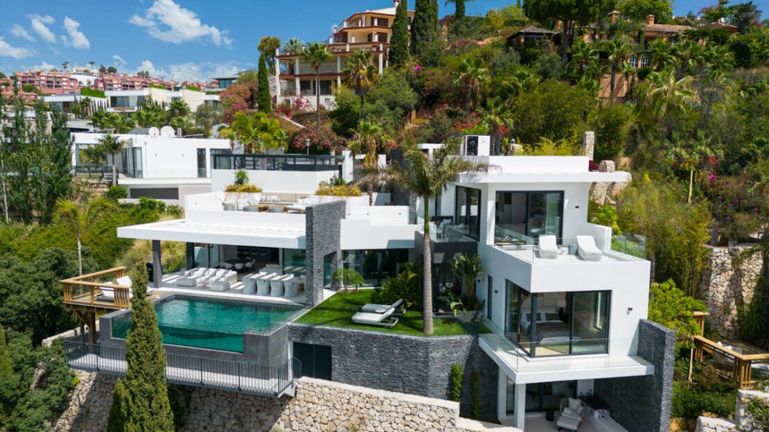 This exceptional property enjoys an elevated position, offering unparalleled panoramic views spanning Marbella and the Mediterranean Sea. The villa’s architectural concept is truly distinctive, divided into two sections interconnected by an internal walkway.