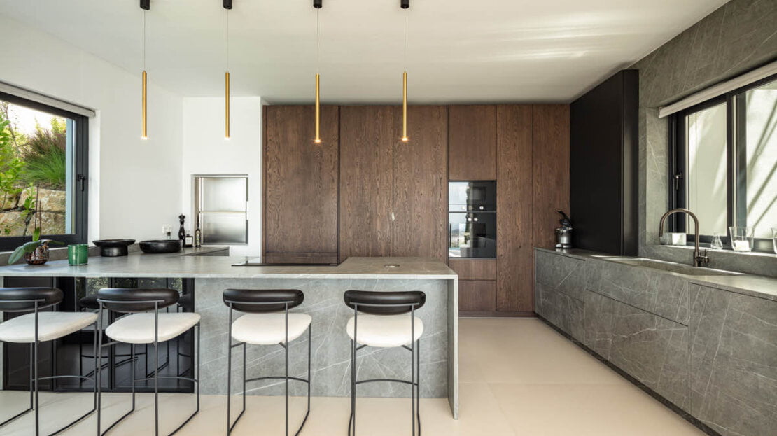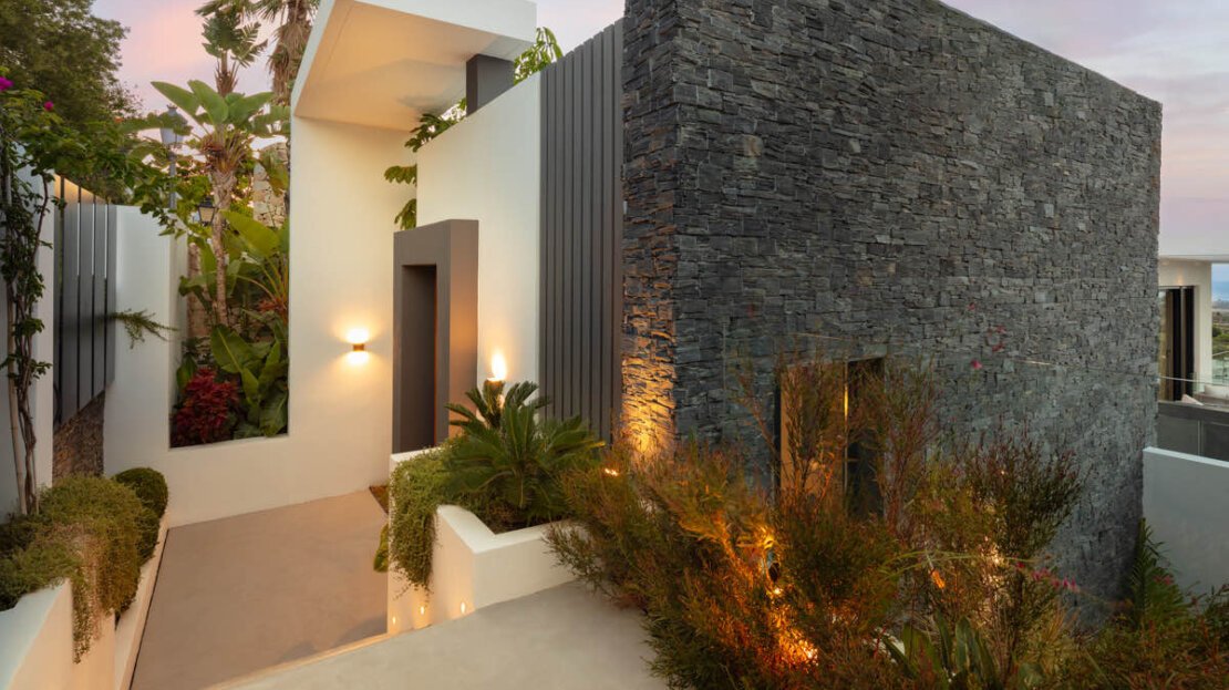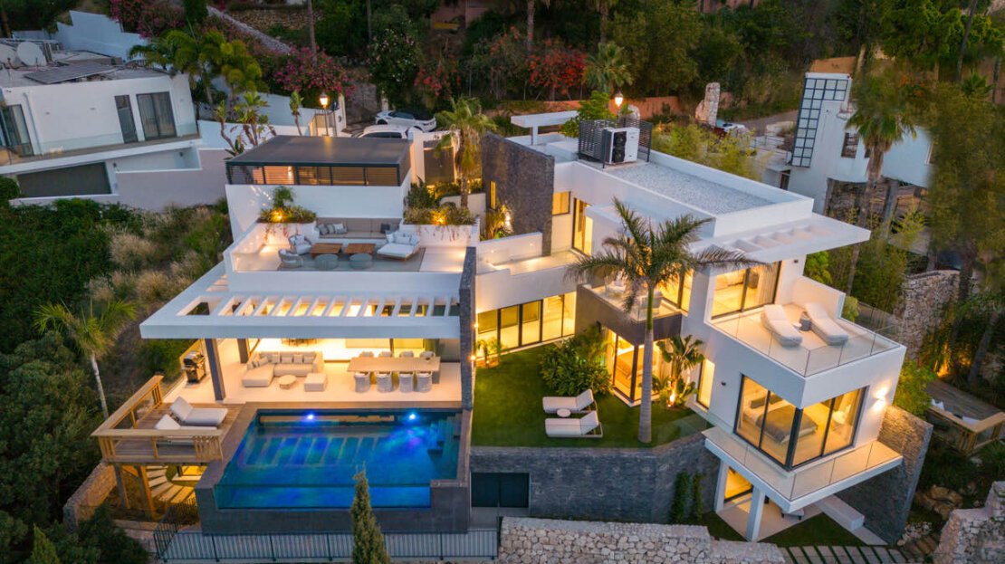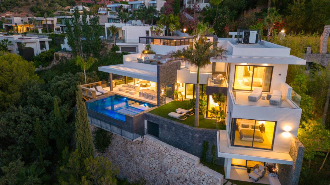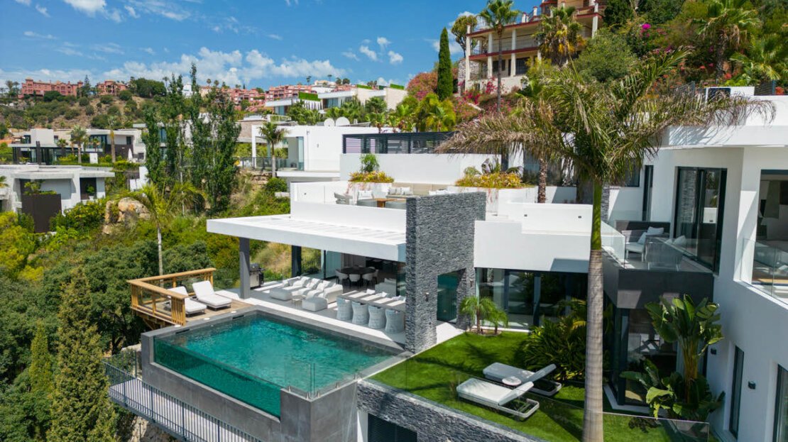 This exceptional property enjoys an elevated position, offering unparalleled panoramic views spanning Marbella and the Mediterranean Sea. The villa’s architectural concept is truly distinctive, divided into two sections interconnected by an internal walkway.