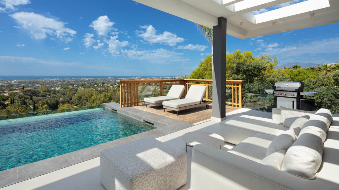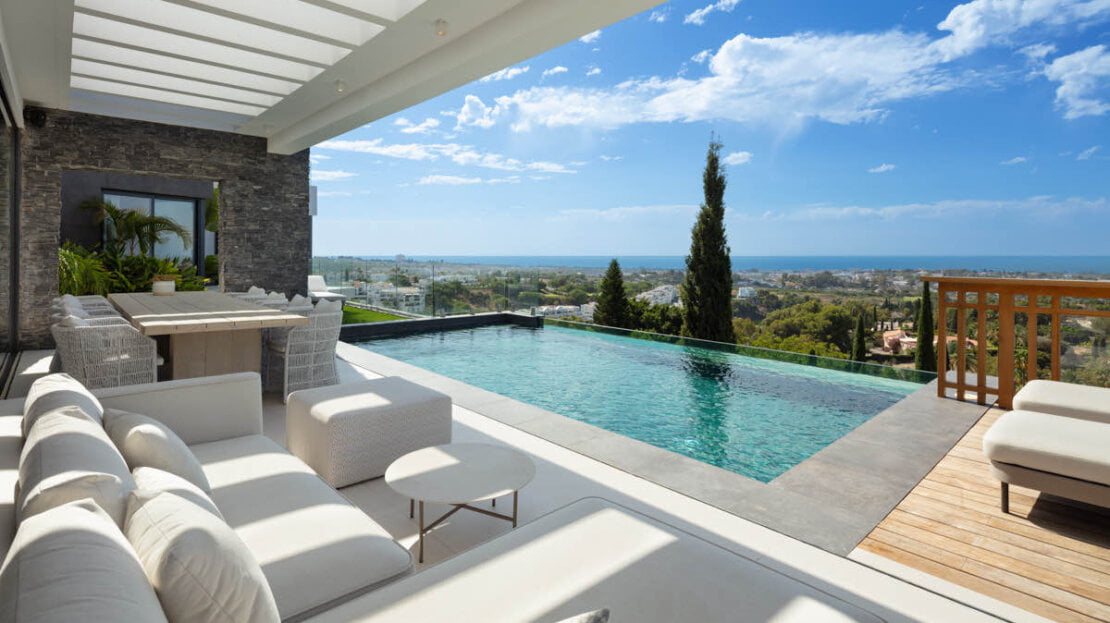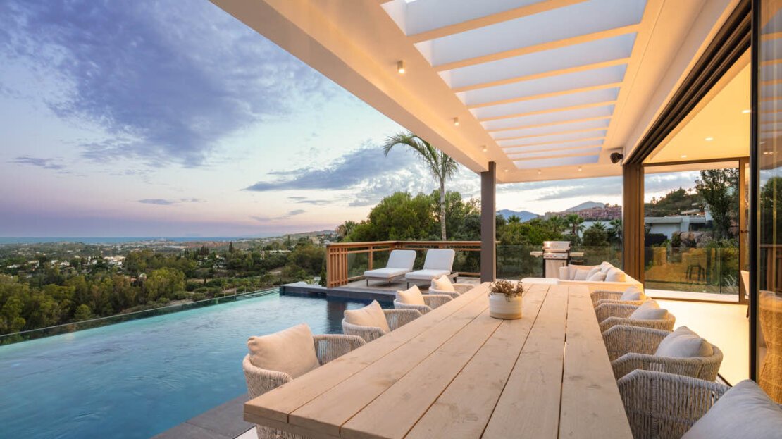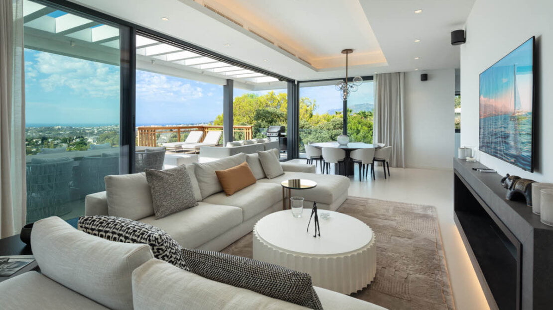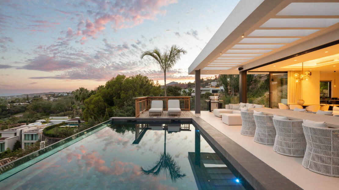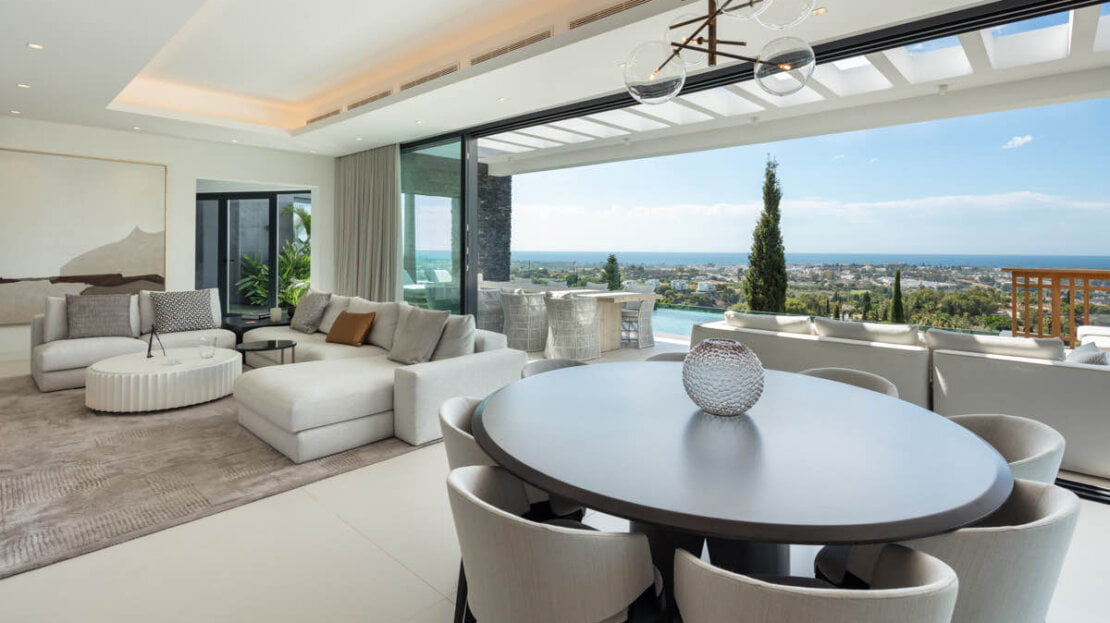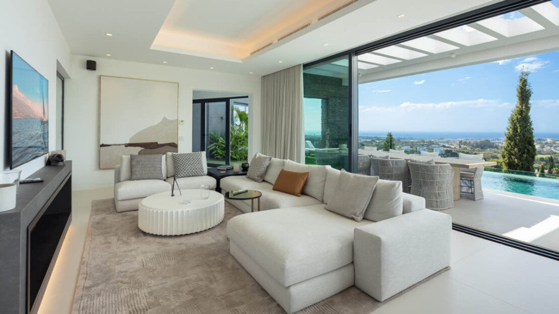 Set on a substantial plot, boasts expansive outdoor terraces and a lush garden. The terrace is thoughtfully designed for alfresco dining and relaxation, providing a perfect setting to embrace Marbella’s delightful climate. The villa’s southern orientation ensures abundant sunlight throughout the day, granting captivating sunrises and sunsets. An inviting zero-edge infinity pool adds to the allure of the outdoor spaces. The living area seamlessly connects to the terrace through expansive glass sliding doors, redefining indoor-outdoor living and framing the interior with stunning views.