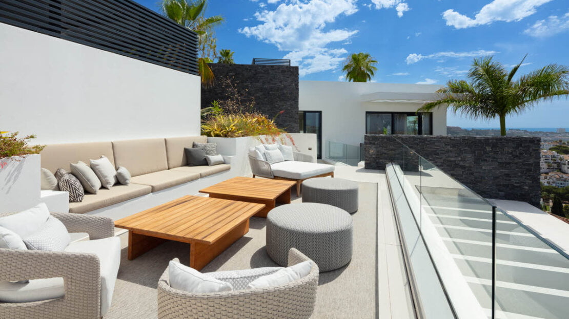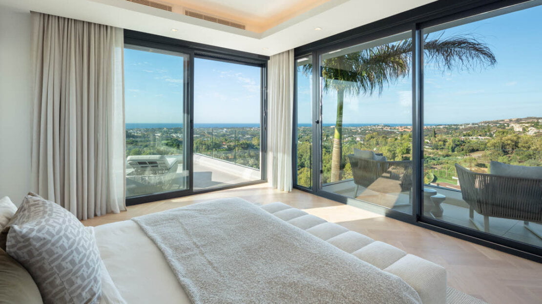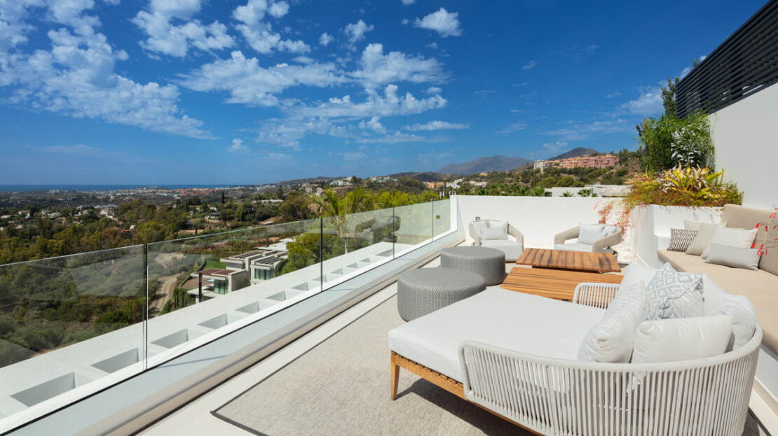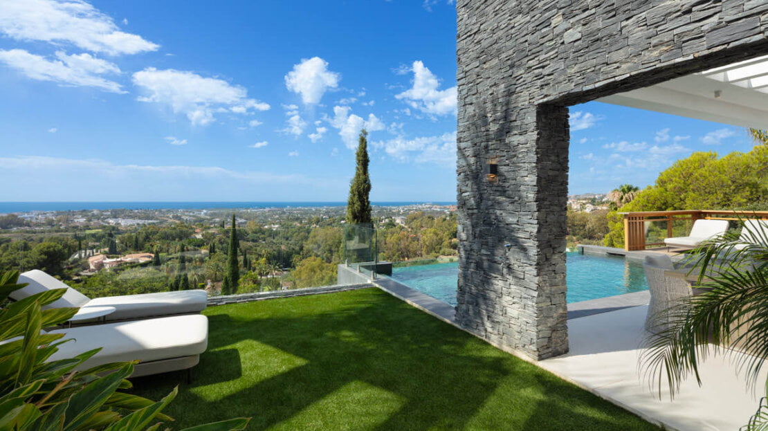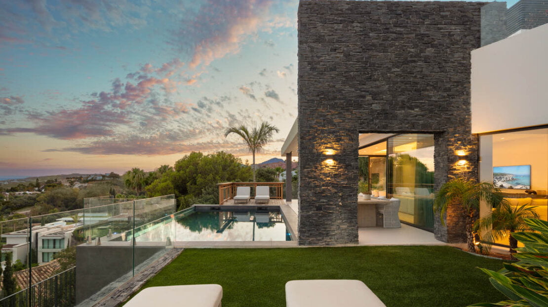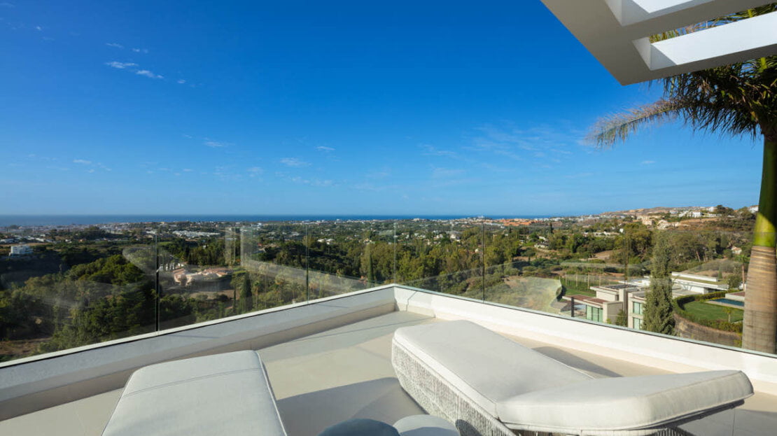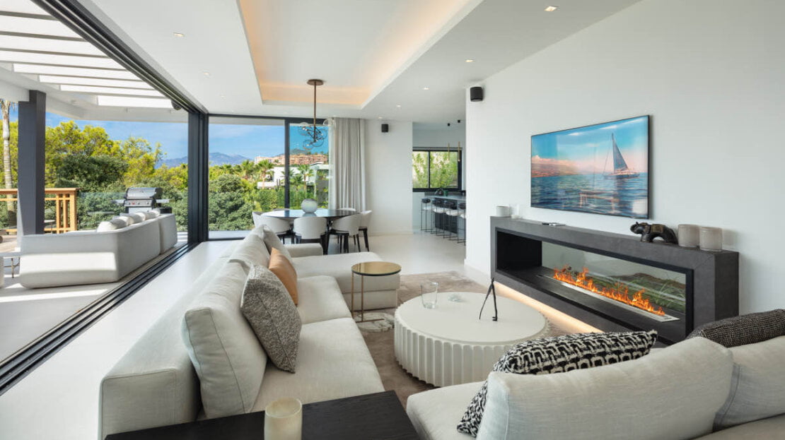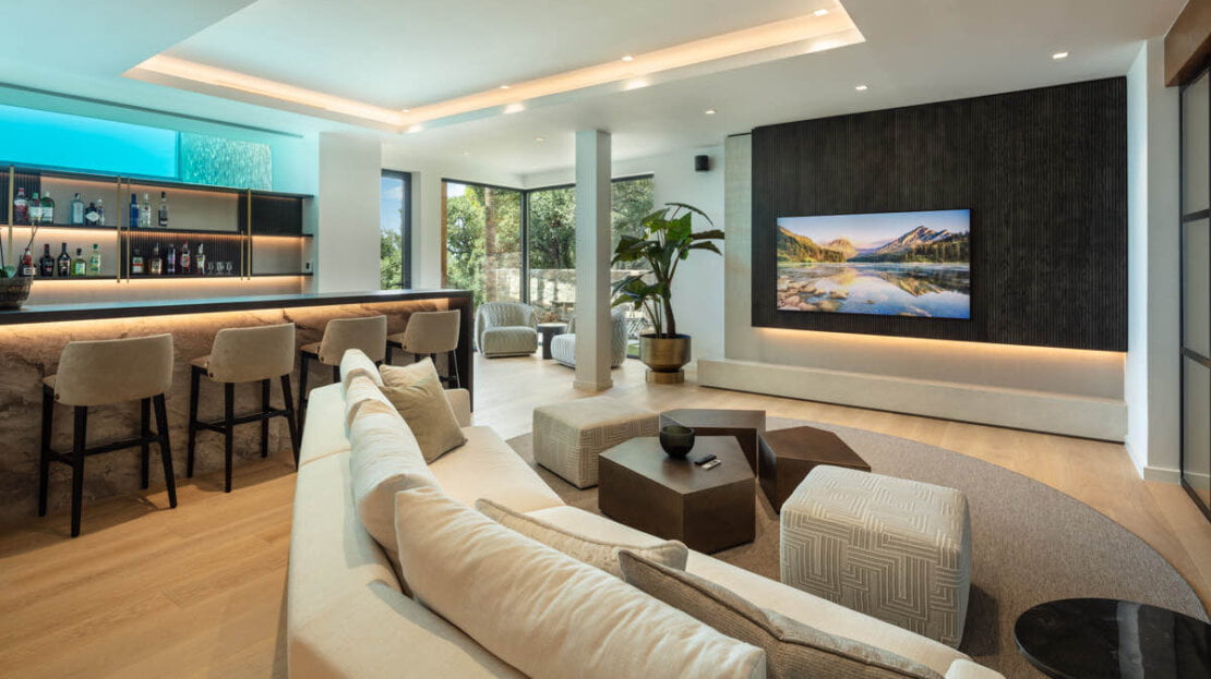 Set on a substantial plot, boasts expansive outdoor terraces and a lush garden. The terrace is thoughtfully designed for alfresco dining and relaxation, providing a perfect setting to embrace Marbella’s delightful climate. The villa’s southern orientation ensures abundant sunlight throughout the day, granting captivating sunrises and sunsets. An inviting zero-edge infinity pool adds to the allure of the outdoor spaces. The living area seamlessly connects to the terrace through expansive glass sliding doors, redefining indoor-outdoor living and framing the interior with stunning views.