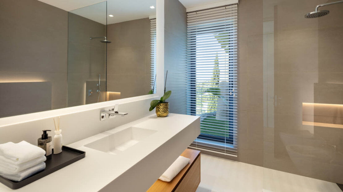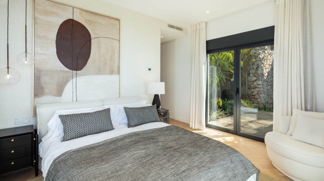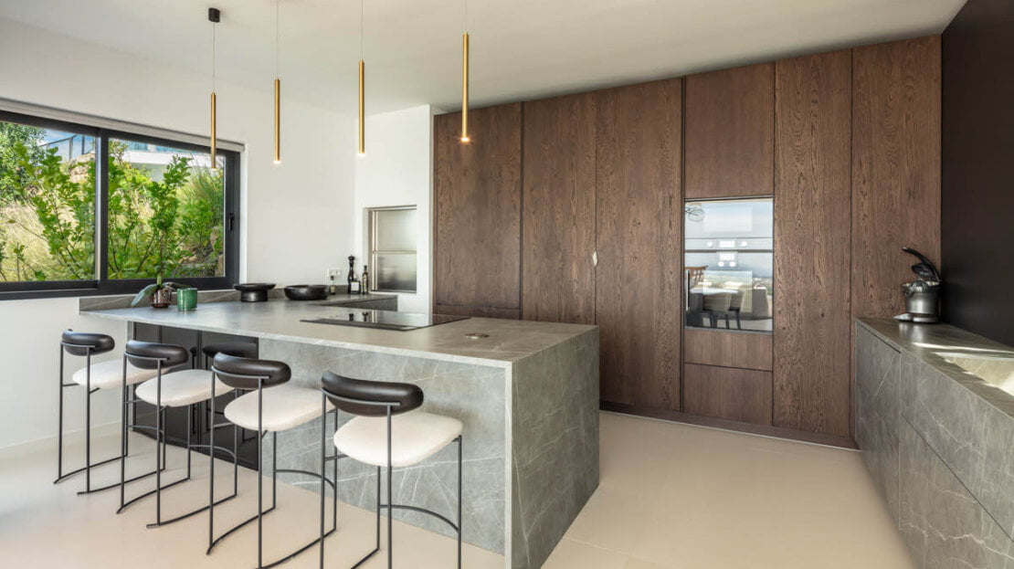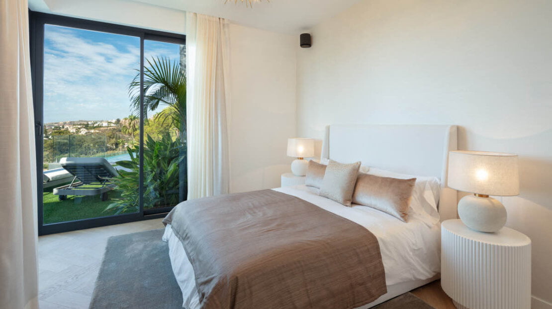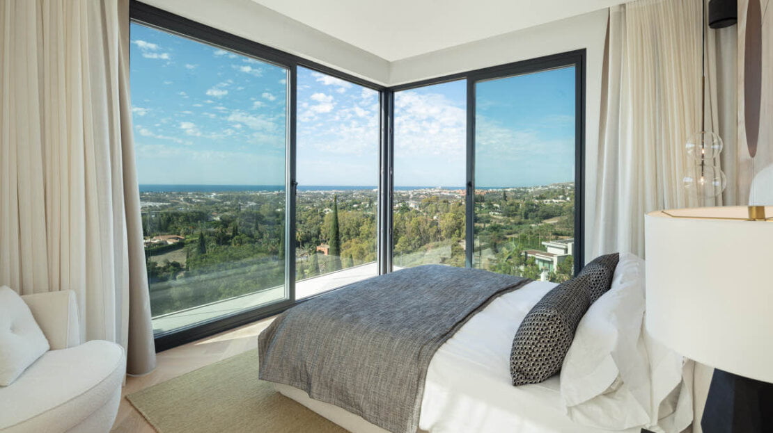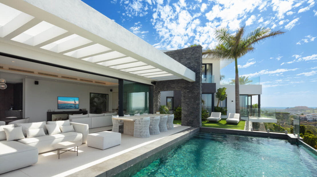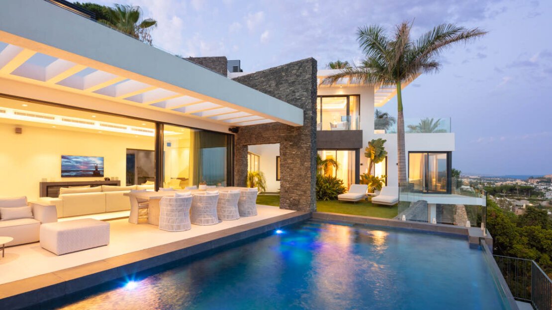 Set on a substantial plot, boasts expansive outdoor terraces and a lush garden. The terrace is thoughtfully designed for alfresco dining and relaxation, providing a perfect setting to embrace Marbella’s delightful climate. The villa’s southern orientation ensures abundant sunlight throughout the day, granting captivating sunrises and sunsets. An inviting zero-edge infinity pool adds to the allure of the outdoor spaces. The living area seamlessly connects to the terrace through expansive glass sliding doors, redefining indoor-outdoor living and framing the interior with stunning views.