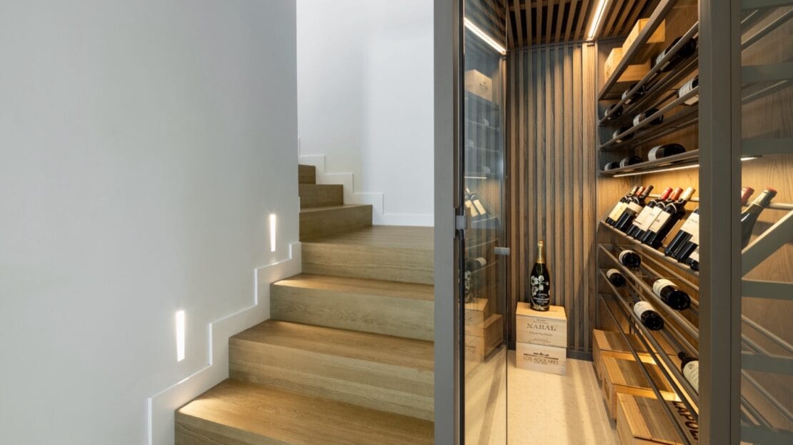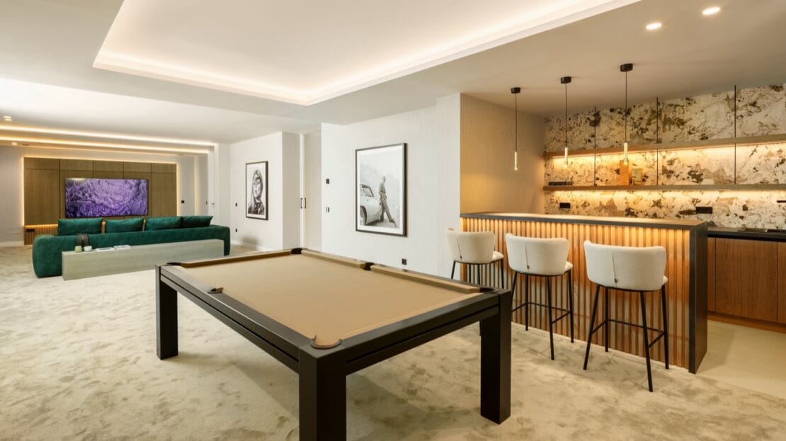 The lower level is a haven for entertainment and wellness, featuring a state-of-the-art home gym, a traditional Hamaam, a sauna, and an entertainment room complete with a custom bar and private cinema. A dedicated wine cellar, integrated Domotics with Apple Home solutions, and premium Bowers & Wilkins sound systems further elevate the living experience. The true gem is the spectacular solarium, showcasing a second pool with hydromassage and ample chill-out spaces to enjoy breathtaking sunsets and host unforgettable gatherings.
