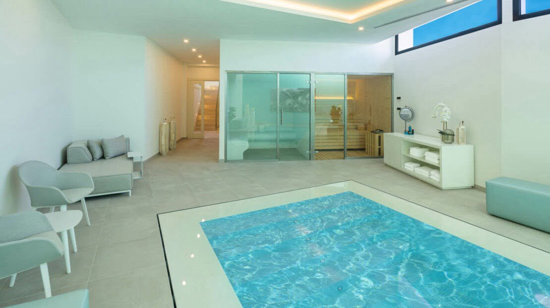 The impressive primary suite offers breathtaking sea views, with a private terrace and luxurious master bath. An additional 4 bedrooms complete the property, multiple entertaining outdoor areas surround the villa, a spectacular rooftop, an infinity edge pool and a private spa centre including an indoor pool, sauna and Turkish bath.