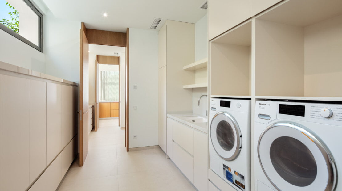 The interiors exude refinement, with every detail meticulously curated using the finest materials, ensuring an unparalleled sense of luxury. The stunning kitchen, equipped with state-of-the-art Gaggenau appliances, is a culinary haven that seamlessly combines practicality with aesthetics. Distributed across 2 floors, most bedrooms are located on the ground level of the property, with striking views across the golf course. The luxurious master bedroom is on the top level of the property, boasting a private oasis for residents to enjoy.