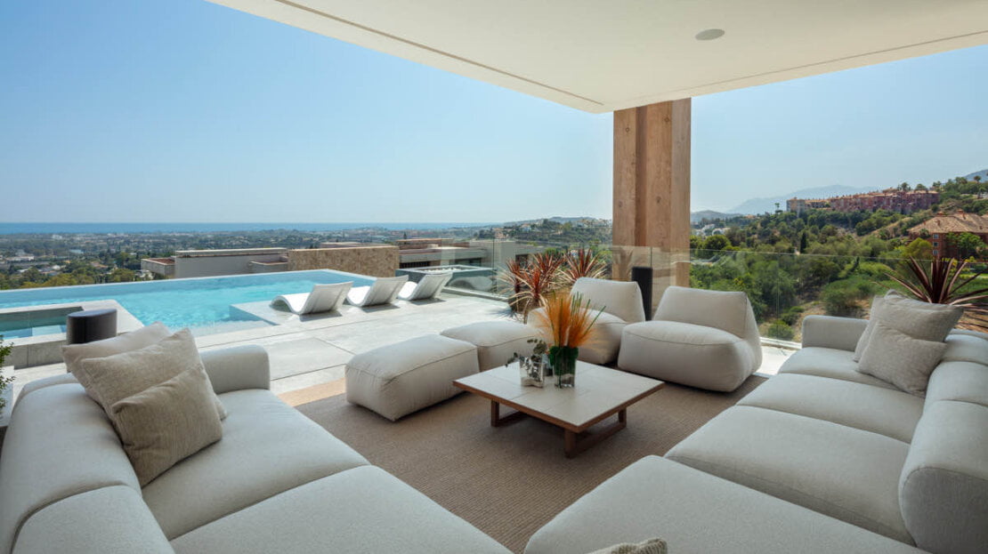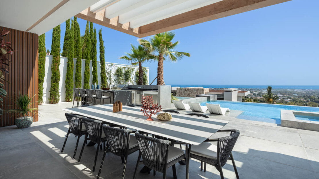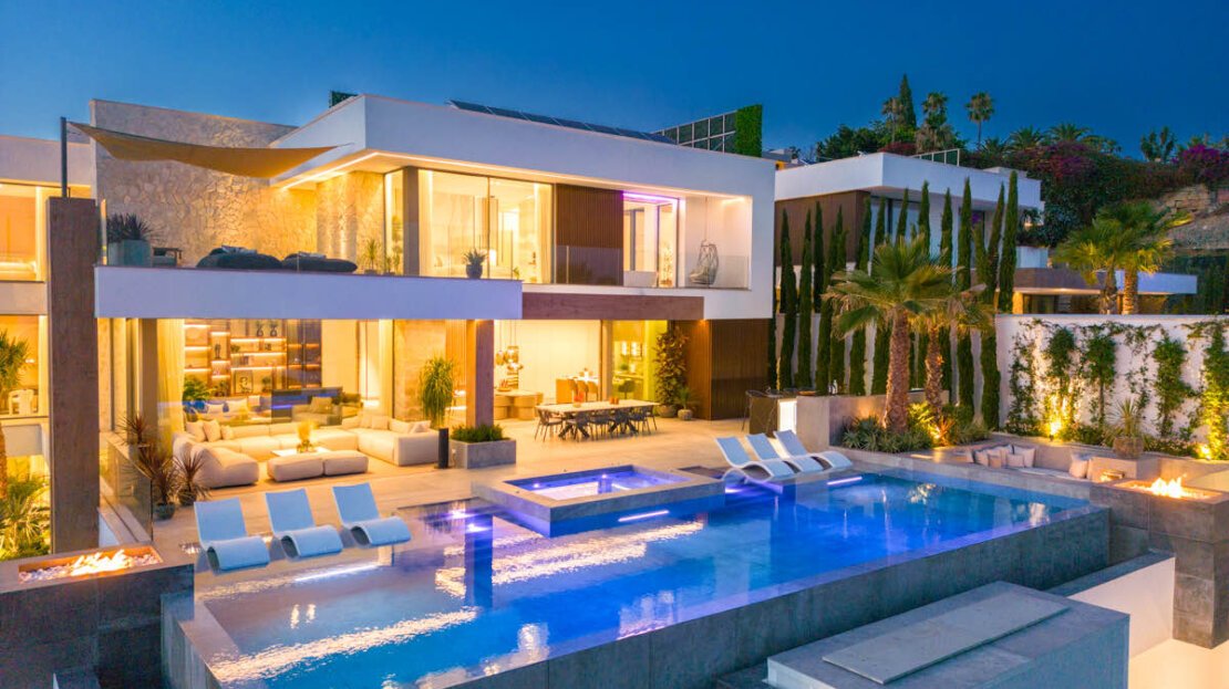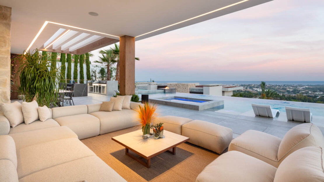 One of the most captivating features of this exceptional villa is the breathtaking panoramic views it offers, stretching from the Mediterranean Sea all the way to the picturesque African coast. From the moment you step foot onto the property, you are greeted with incredible views that stretches beyond the horizon. The contemporary design of the villa encompasses vast and open living spaces, seamlessly blending the interior with the exterior. The centrepiece is a stunning zero-edge pool that appears to merge with the surrounding landscape, creating a visual spectacle that captivates the senses. This pool area is complemented by an outdoor cinema, providing an enchanting space for entertainment under the stars.