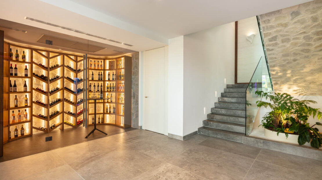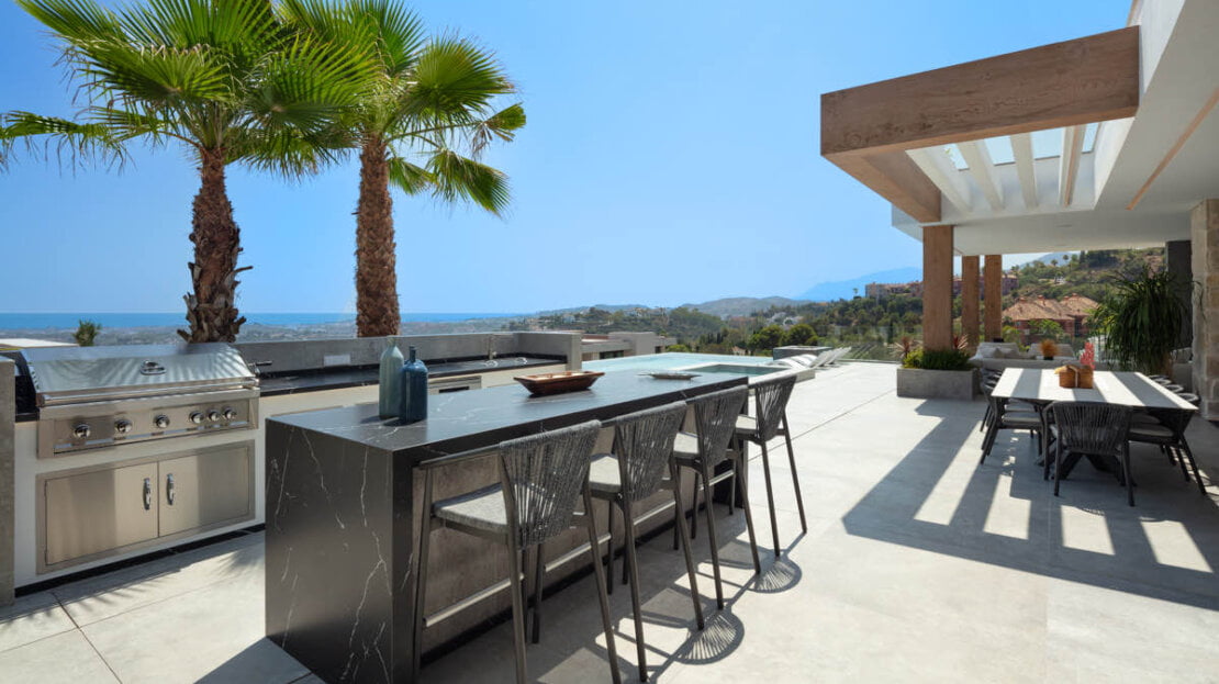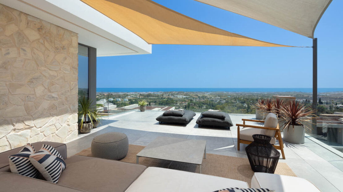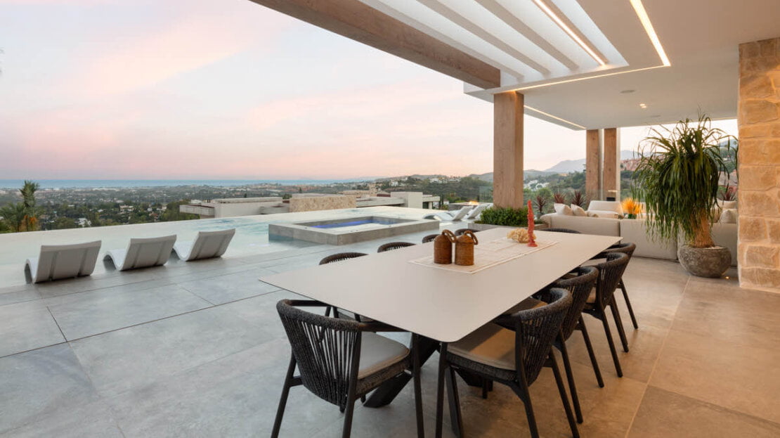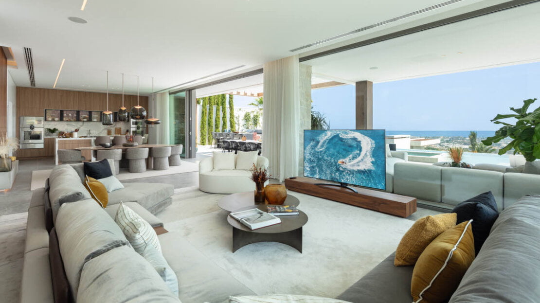 One of the most captivating features of this exceptional villa is the breathtaking panoramic views it offers, stretching from the Mediterranean Sea all the way to the picturesque African coast. From the moment you step foot onto the property, you are greeted with incredible views that stretches beyond the horizon. The contemporary design of the villa encompasses vast and open living spaces, seamlessly blending the interior with the exterior. The centrepiece is a stunning zero-edge pool that appears to merge with the surrounding landscape, creating a visual spectacle that captivates the senses. This pool area is complemented by an outdoor cinema, providing an enchanting space for entertainment under the stars.