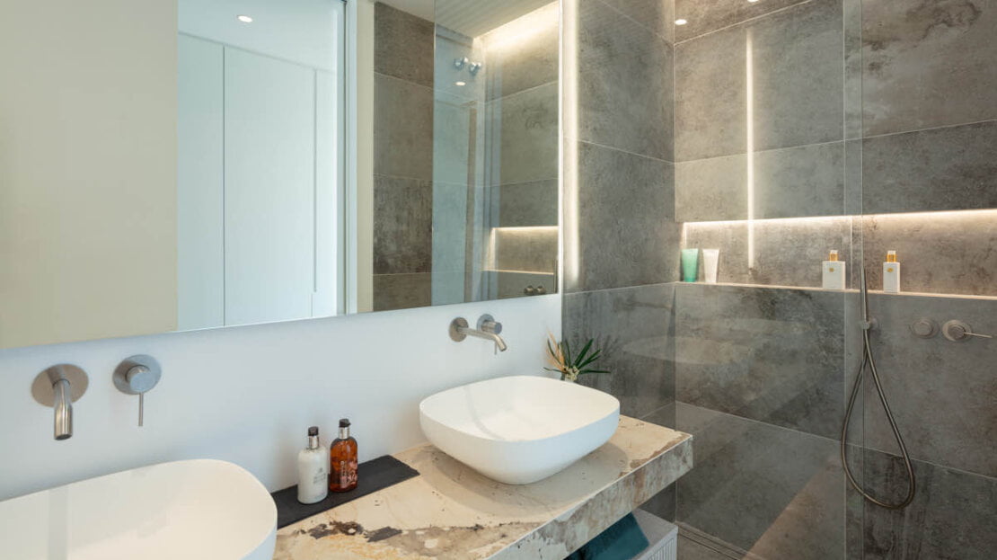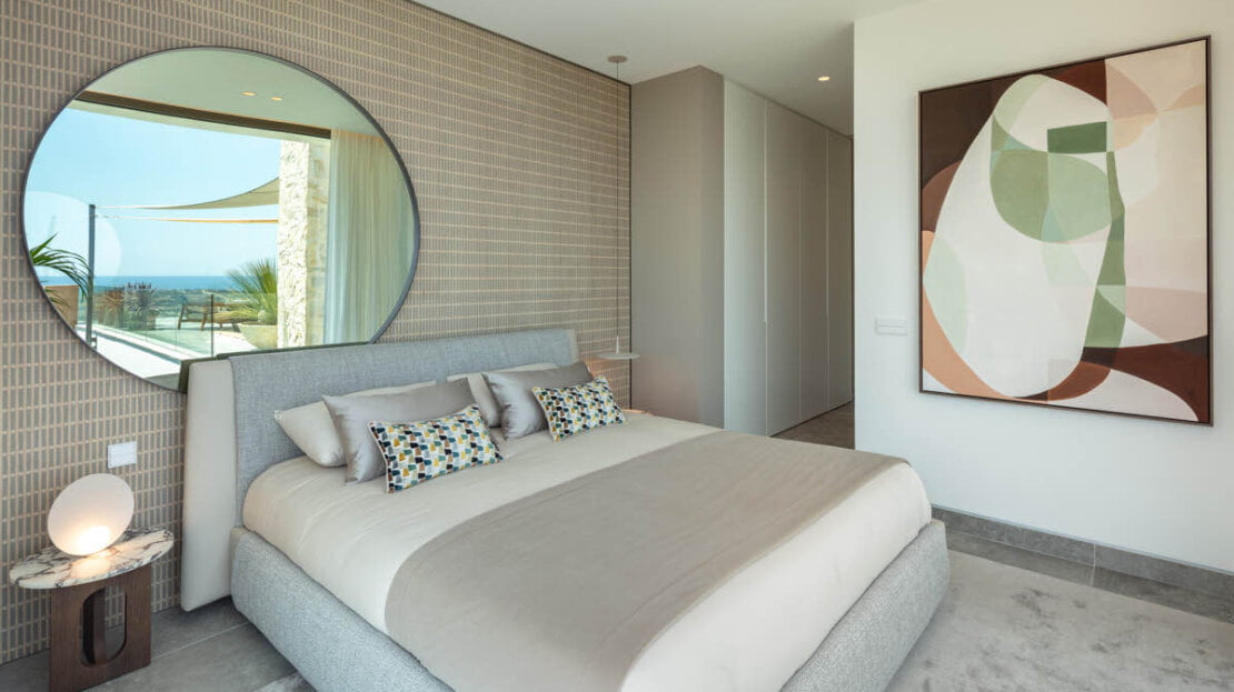 The villa features six exquisitely designed bedrooms, each showcasing the highest level of craftsmanship and elegance. The master bedroom, in particular, is a sight to behold, as it offers sweeping views of the shimmering sea, providing a serene and picturesque retreat. A custom-designed walk-in closet adds a touch of extravagance to the master suite, leading into a luxurious bathroom where you can indulge in the epitome of luxury.