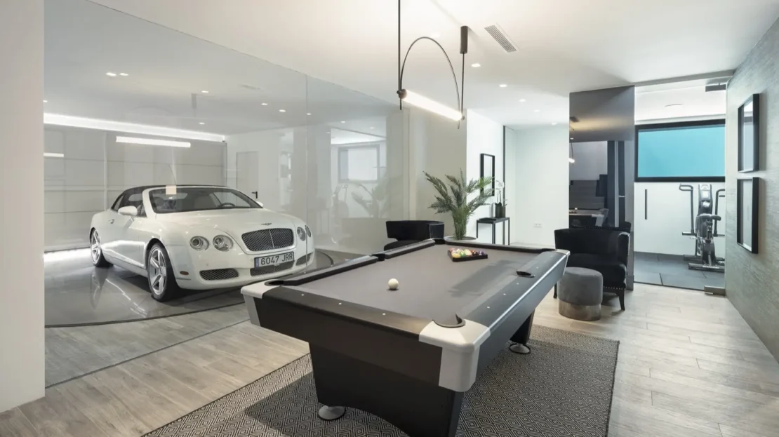 The villa spans three levels, including a basement, and features a spacious solarium roof terrace. The basement houses a private garage with a turntable mechanism, a vibrant entertainment area complete with a TV/cinema room, wine cellar, lounge, a nicely-sized staff or guest bedroom with an en-suite bathroom, as well as a laundry room, guest WC, and a technical room.