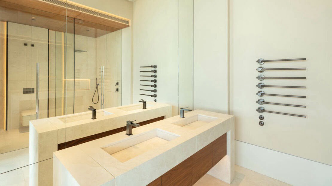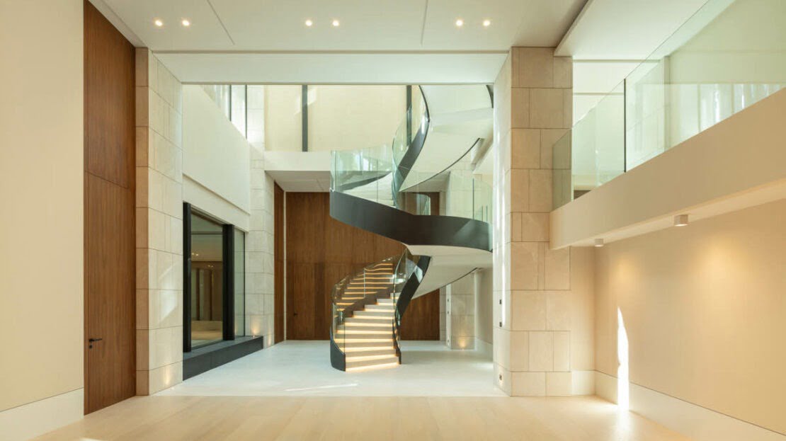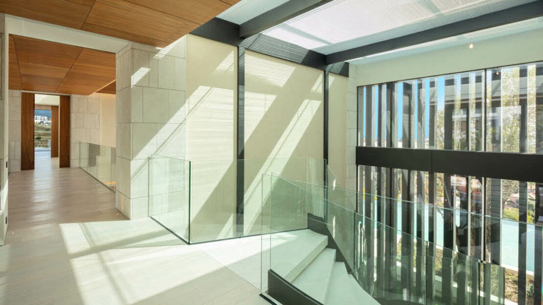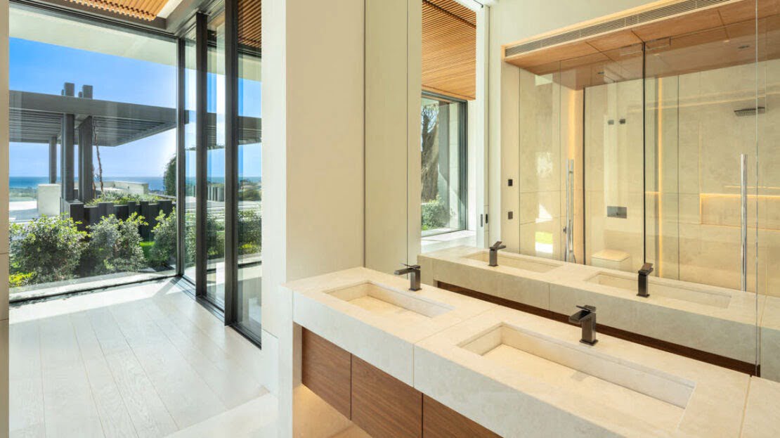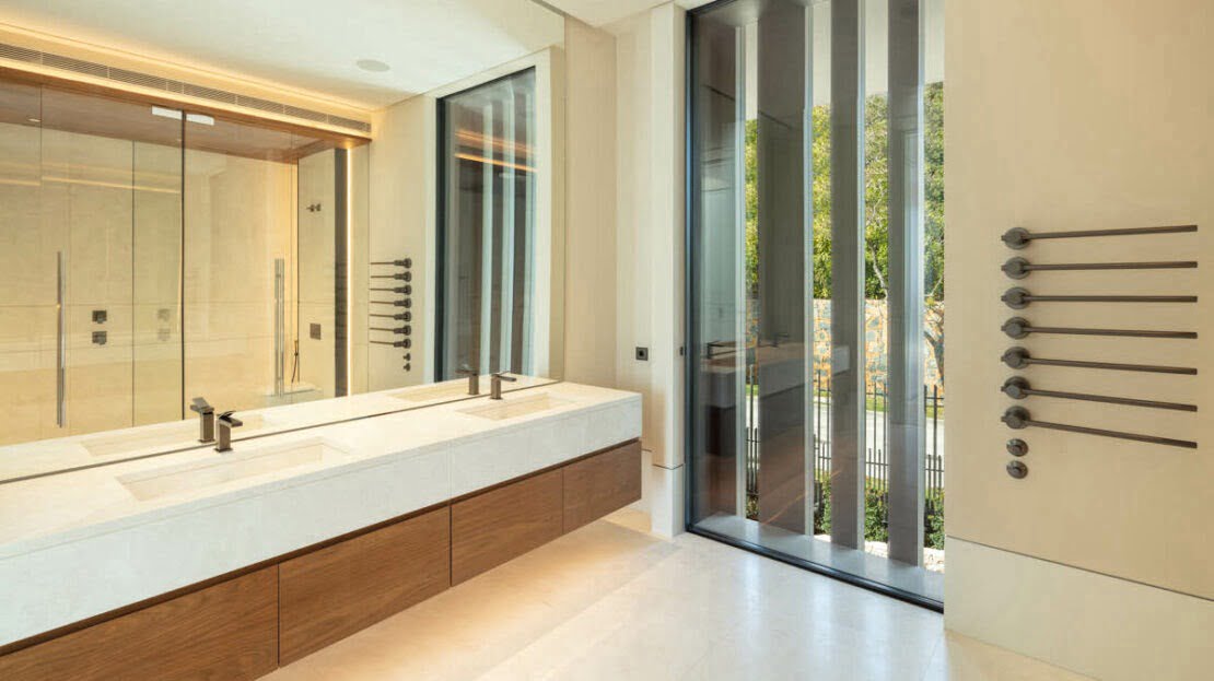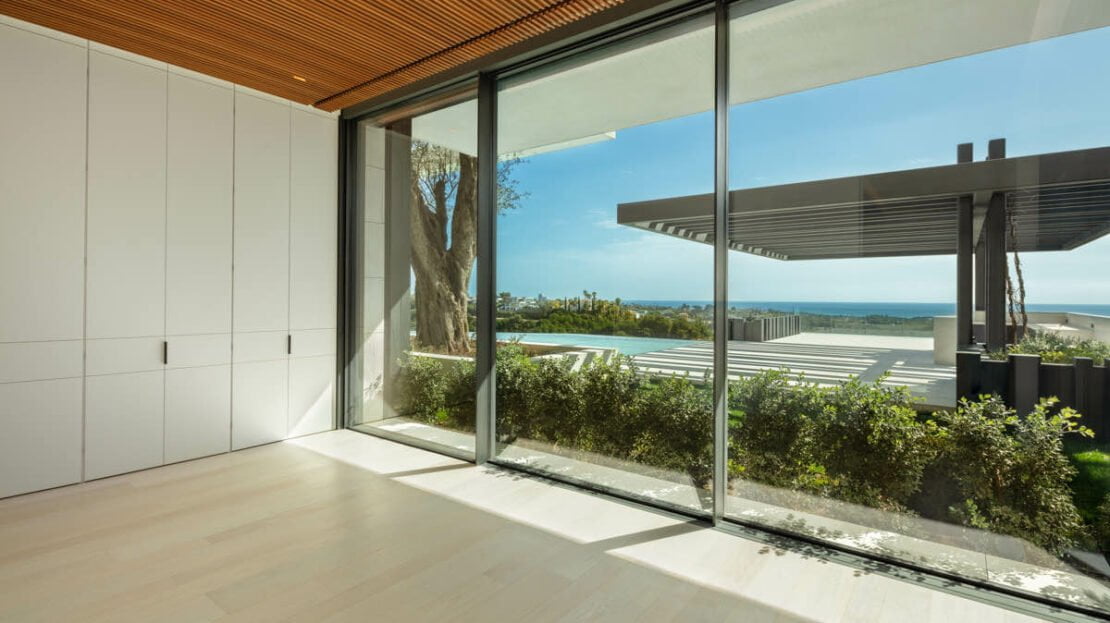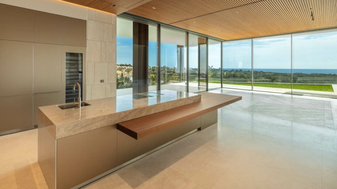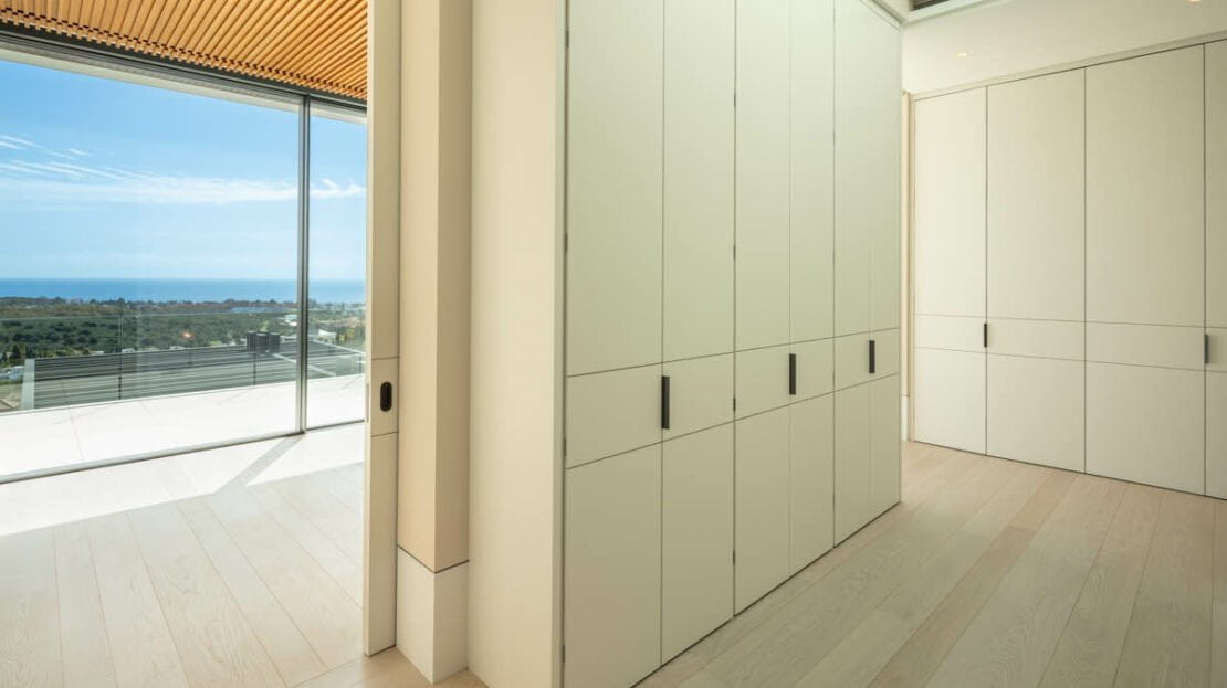 The villa has been finished to the highest quality standards, with flawless architectural features throughout. Otto welcomes you into an impressive entrance area, with magnificent water features. The entrance consists of a stunning entrance hall, with high ceilings and direct access to the open-plan living spaces. Expansive floor- to-ceiling windows open up to the magnificent views to the coastline. The masterpiece of this luxurio0us home is the impressive staircase, connecting all levels in the most luxurious way. The living room is generous and very bright, boasting a high quality wooden floor and a modern gas fireplace. The open-plan custom Bulthaup kitchen offers a sleek design and makes every chef’s dream come true, with high quality Gaggenau appliances and an extraordinary attention to details. Otto bedrooms are truly breathtaking, surrounded by an idyllic setting with magnificent views, all bedrooms are distributed over the three levels with the master bedroom and a generous guest bedroom on the upper level.