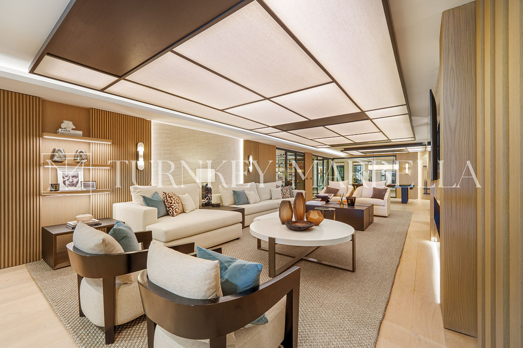 The lower level delivers one of the most comprehensive amenity suites on Marbella. Wellness facilities include an indoor pool, spa, steam room and sauna, as well as a fully equipped gym. For entertainment, a cinema room, a sophisticated wine cellar with lounge area, and a dedicated bar create multiple spaces for hosting at the highest level. A six-car covered garage completes this exceptional provision.