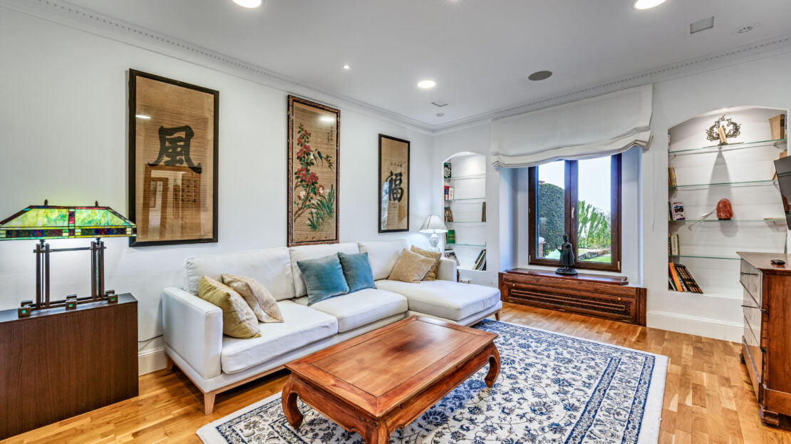 Spacious living area with an adjacent library