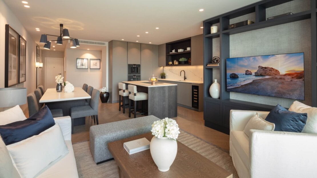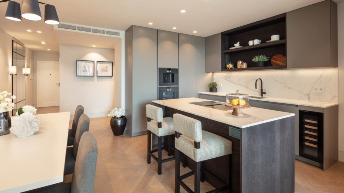 The interior design of the apartment is sophisticated, incorporating the finest materials to create a refined and tranquil atmosphere. The open-plan layout maximises the use of space, while the modern design and carefully curated colour palette add to the calming yet luxurious ambiance. Each of the bedrooms has its own unique character and feel, showcasing the apartment’s individuality and elevated approach to interior design.