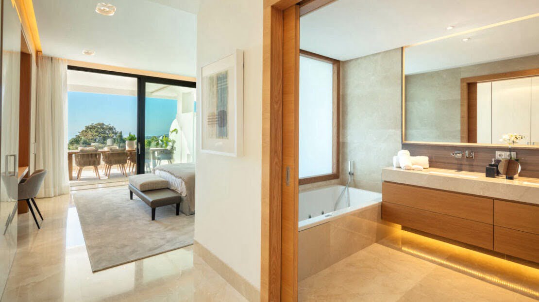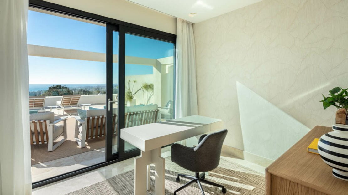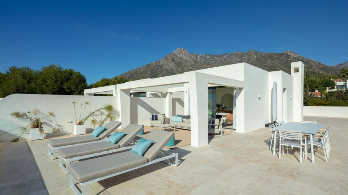 Welcomed by a luminous living area, an optimal open plan layout, expansive terraces and a spectacular solarium, this property provides a private oasis to enjoy the best Southern Spain has to offer. The contemporary kitchen has been designed by SieMatic, with the use of sleek materials and including high quality appliances. The main level includes 3 generous bedrooms with elegant en suite bathrooms and fitted wardrobes, all boasting of scenic nature views. The iconic roof top terrace has been totally prepared to be equipped with all luxury features one might need to entertain.