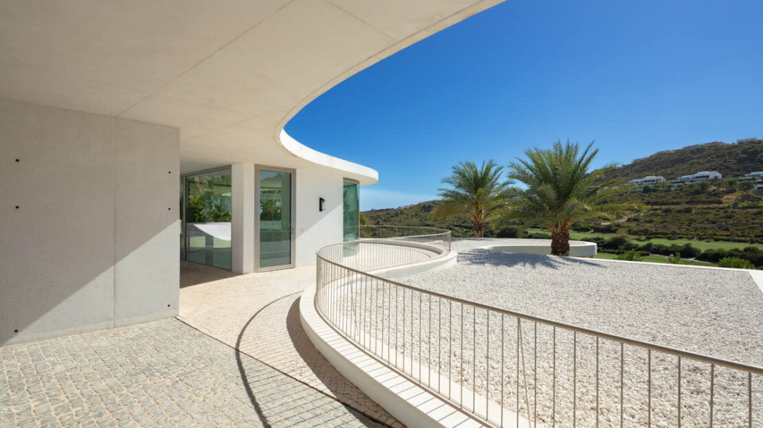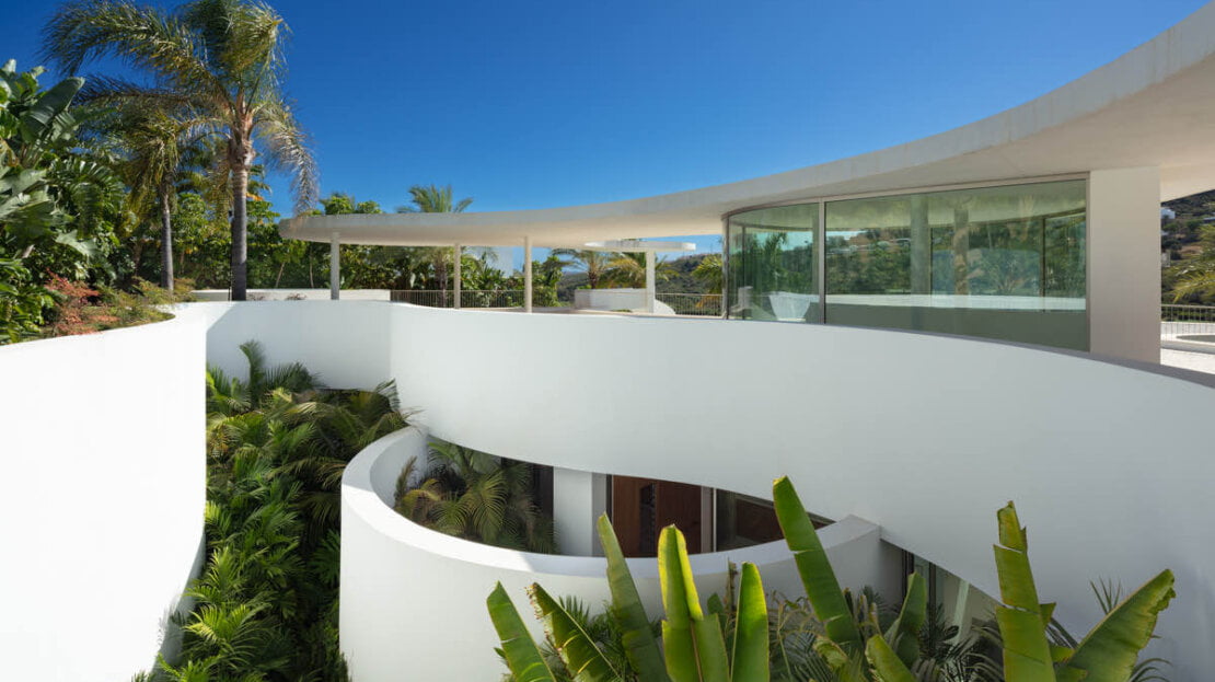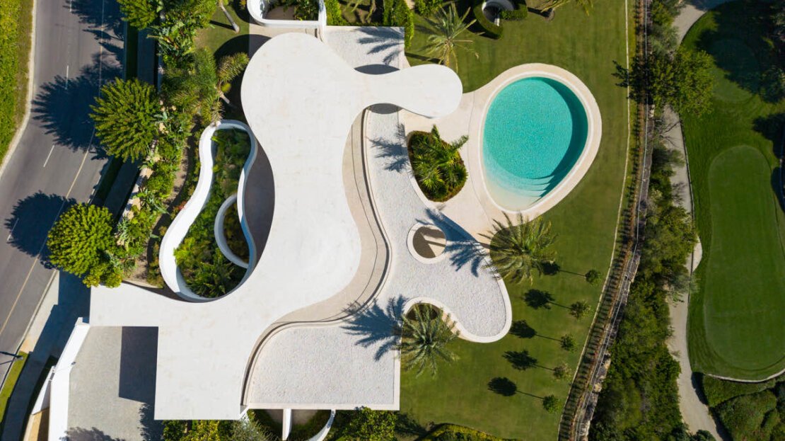 This prestigious villa stands as a testament to architectural ingenuity, capturing the essence of uniqueness and sophistication. Designed by the visionary minds of Vicens & Ramos architects, its futuristic yet nostalgic structure commands attention with its flowing lines and harmonious integration within the lush green surroundings.