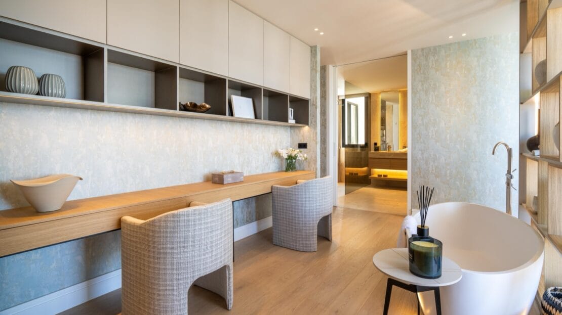 The upper level is dedicated to the master suite and additional guest bedrooms. The master retreat, with direct terrace access, boasts a spacious walk-in closet and a luxurious en-suite bathroom complete with a standalone bathtub, walk-in shower, and double vanity. Meanwhile, the lower level elevates your lifestyle with a state-of-the-art home gym, a private cinema, a lavish spa complete with a sauna and indoor pool, and a dedicated wine cellar—all enhanced by integrated domotics and premium Bowers & Wilkins sound systems.